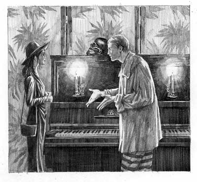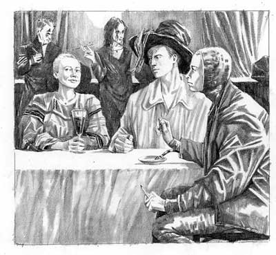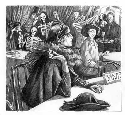 ![]() | デカダンクラブ「月の子供たち」でのアリーナ。麻薬中毒で、病的です。後ろでにやけているのはロマノフ。コズロフスキーによって、おでこに目の模様を描かれてます。 |