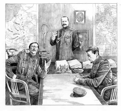 ![]() | 防諜部門のジュコーフスキー将軍(真ん中)と、コズロフスキー大尉(左)。右のがっくりきている人物は、シャーホフ中佐。 |
