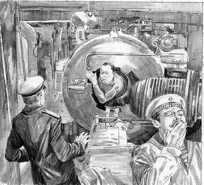 テオフェルスは、対空機銃のエンジニアのふりして、戦艦マリヤに潜入する。ちょっとガードが甘すぎるぞロシア海軍。