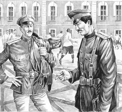 ![]() | 近衛騎兵連隊の友人に出会ったコズロフスキー公爵(右)。落馬&ケガで、華の騎兵からダーティーな防諜部隊に転属したため、会わせる顔がない。こういう、挫折のトラウマを抱えたキャラは好きですねー。 |
