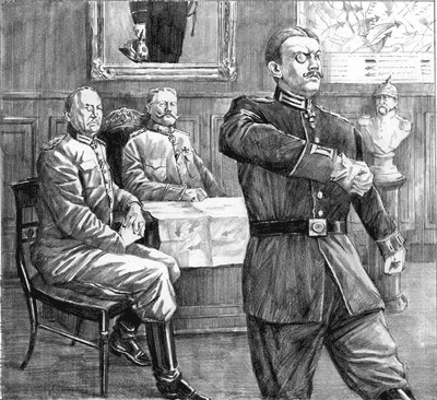 ![]() | 上官たちに報告して、帰るテオフェルス。真ん中のヒゲ将軍は、フォン・ヒンデンブルクにそっくりですね。 |