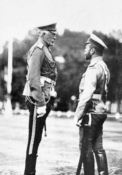 ![]() | 作品中でムーロメツを観閲する、ロシア軍総司令官ニコライ大公(左)。2mの長身。足が長すぎですね。右は皇帝ニコライ二世。 |