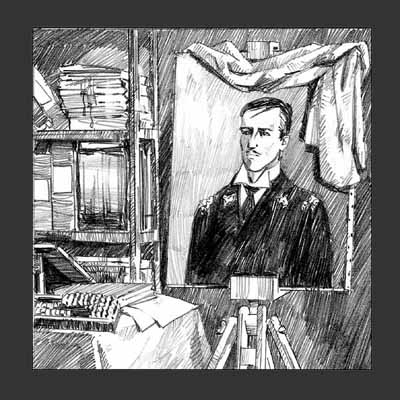 ![]() | "フォン・マック&サンズ"監査室(?)の風景。画家志望のマヴラは、社員でもないのにやって来て、ファンドーリンの肖像画を描いている。左上の写真は、ペテルブルクから来た捜査官バニューヒン。 |