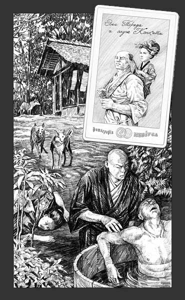 ![]() | 風呂でお亡くなりのメイタンと、第一発見者の修行僧アラキ。後ろで倒れているのは、メイタンの妻のサトコ。 右上の写真は、体だけ子供なみに小さい女性エミと、彼女を背負って歩く召使のケンスケ。 |