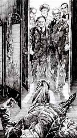 ![]() | 事件にケリをつけるため、元夫ハン・アルタイルスキーを射殺しようとするエリザ。左下の写真がアルタイルスキー。エリザの隣にいる男はジェビャートキン。 |