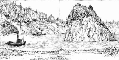![]() | ヴォルガ川に突き出た断崖の小島。ヨットみたいな船の形に見立てて「一つの帆」島と呼ばれており、頂上に「我が憂いを癒し給え」修道院が建てられています。 |