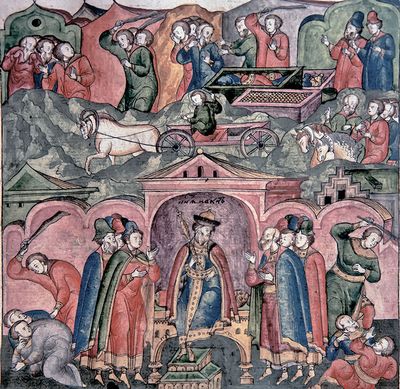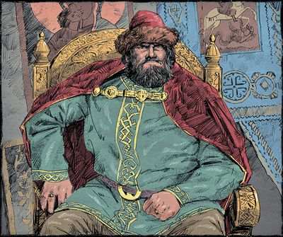 ![]() | ウラジーミル大公に即位するモスクワ公のイワン・カリター。「カリター」とは財布のことで、賄賂でモンゴルのハーンに取り入って、勢力を拡大した人物。モスクワがロシアの中心になる基礎を築いたそうです。 |