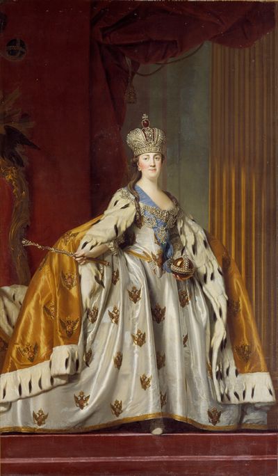![]() | 大帝エカテリーナ二世。ドイツの小領主の娘でロシア皇帝ピョートル三世の妃になるが、夫を追い落として女帝になったというからすごいですね。 |
