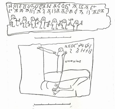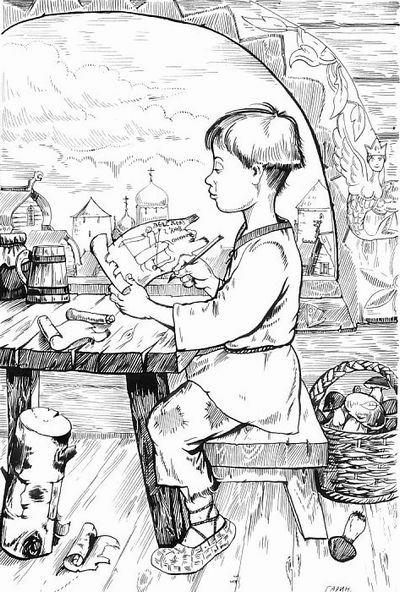 ![]() | 中世のノブゴロド市は、その後の時代よりずっと発展していて、住民の識字率も高かったそうで。1230年ごろに書かれた、オンフィムという推定6-7歳の少年の落書き。学校でアルファベットの練習中に、木の皮のノートに書いたらしい。 上はアルファベットの練習と、友達の絵。下は騎兵になって敵を倒すオンフィムの姿。真ん中に「オンフィム」と名前が書いてあります。こんなのが残ってるなんてすごいですね。 |