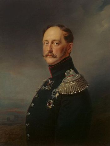 ![]() | ロシア皇帝ニコライ一世。即位するなりデカブリストの乱が起こり、反動的な厳しい政策をとる。同時代の人からもえらく嫌われていたようです。 |